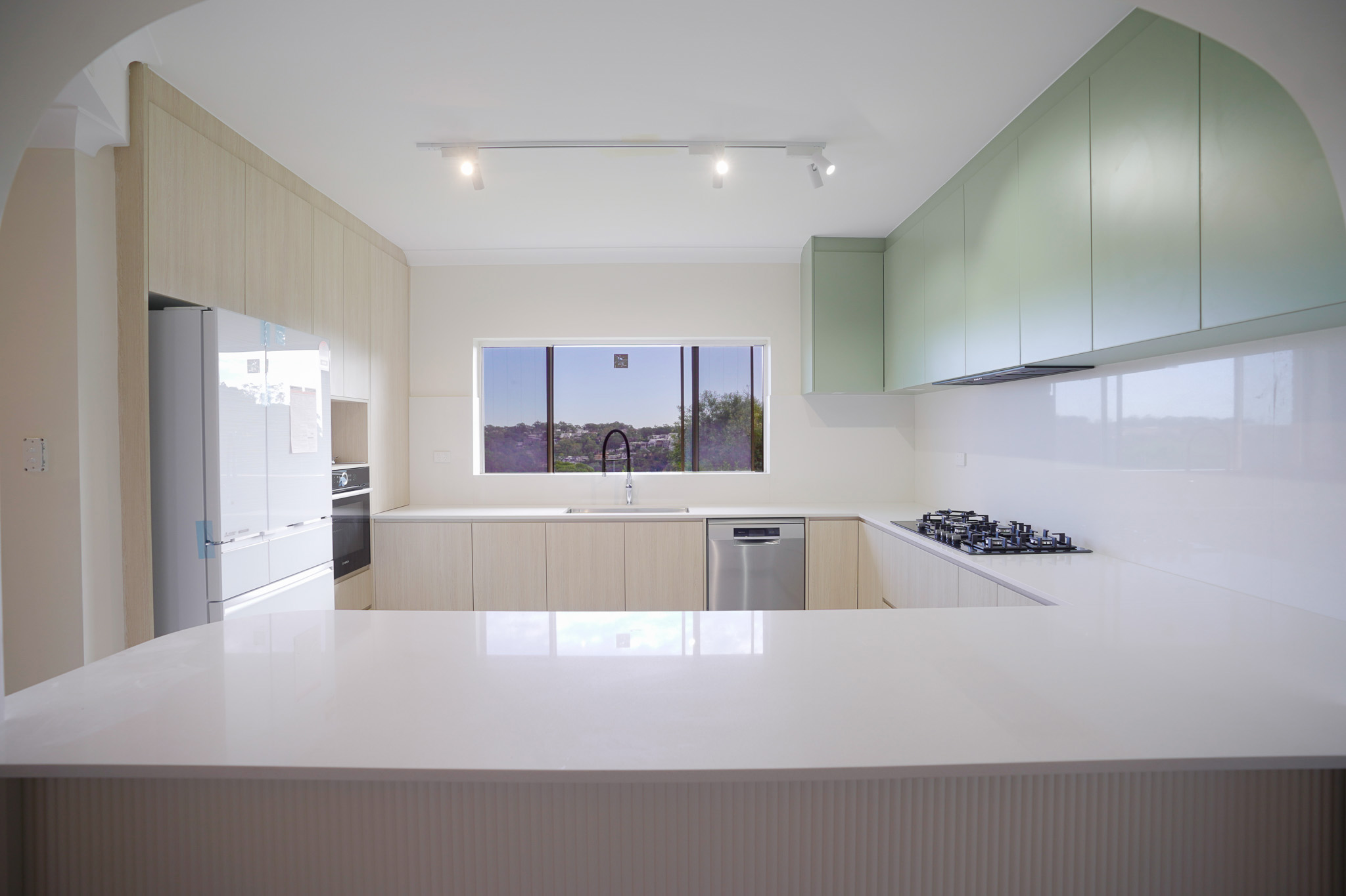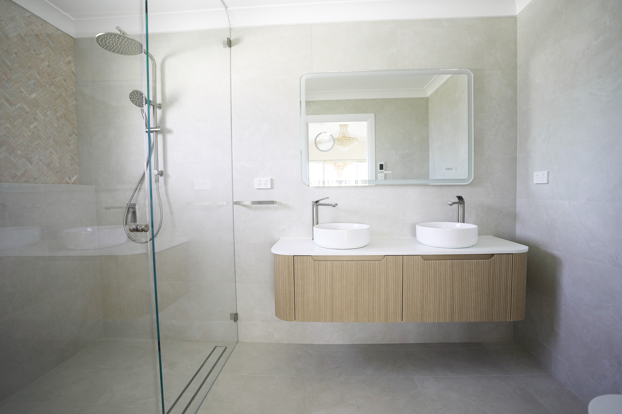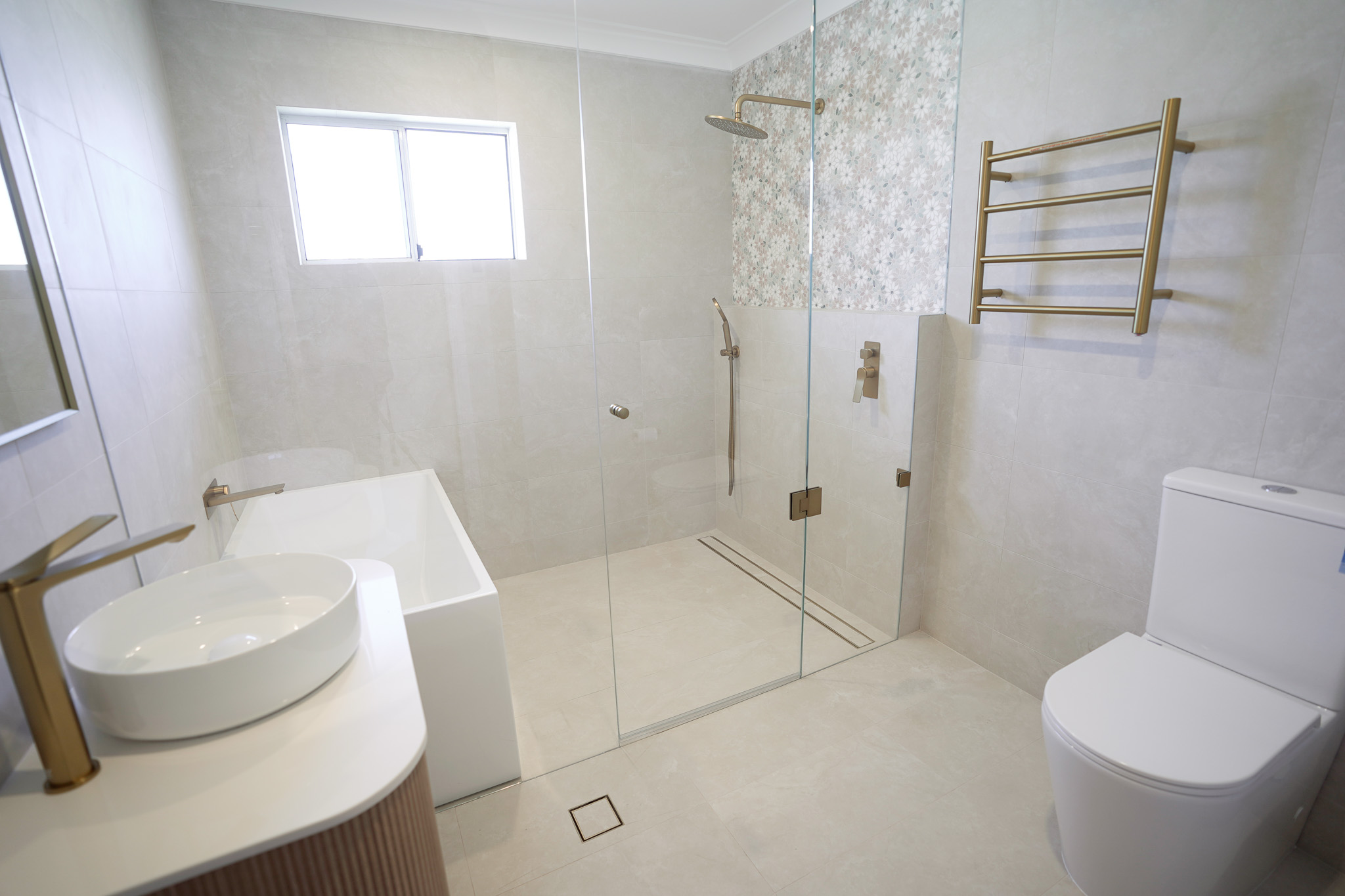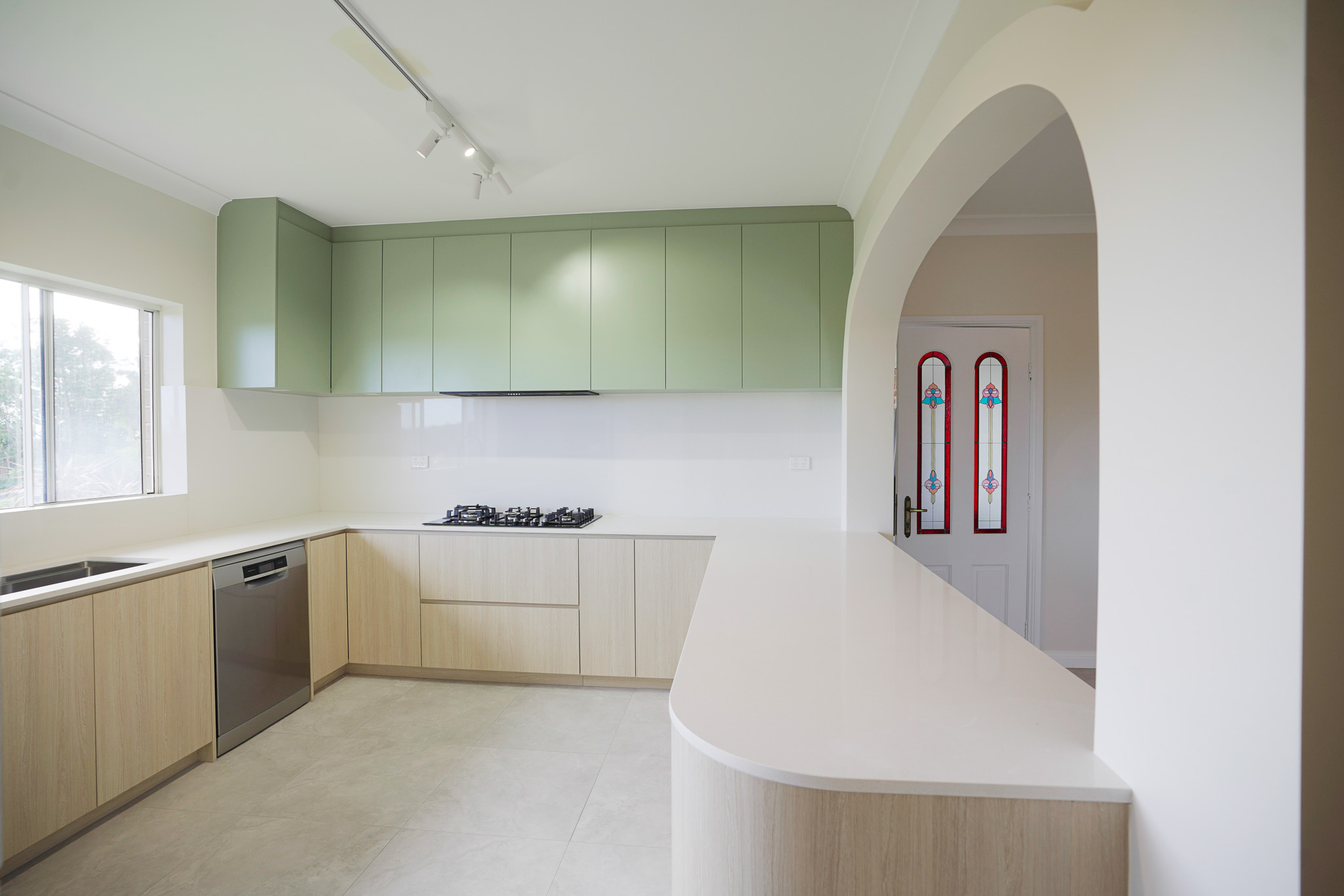 This Illawong renovation transformed an out-dated wallpapered home into a bright and modern family retreat. We reimagined the kitchen with a curved benchtop to open up the space, then completely refurbished all bathrooms with floor-to-ceiling shower screens, his-and-hers showers, underfloor heating, and introduced a Japanese-inspired layout featuring mosaic tiles and a serene bathtub area. A new laundry with mint-green accents, and a timber feature wall in the master bedroom complete the perfect blend of warmth and contemporary style, just to name a few..