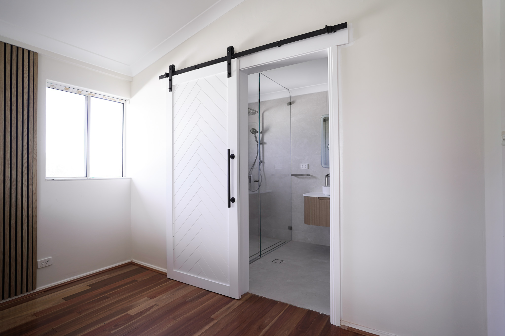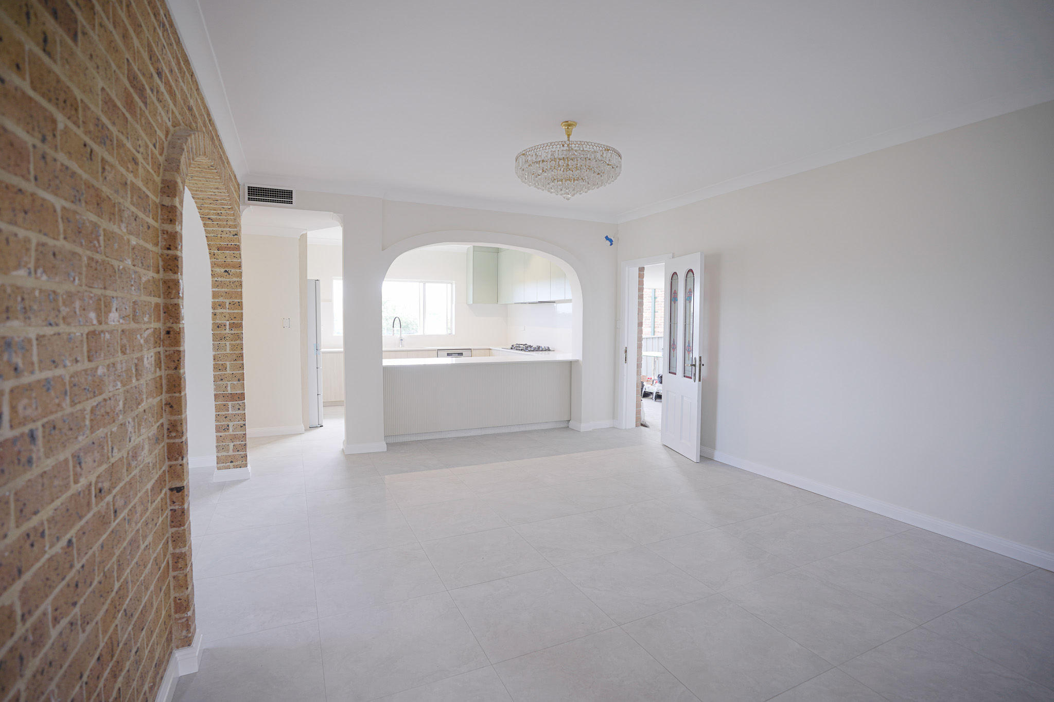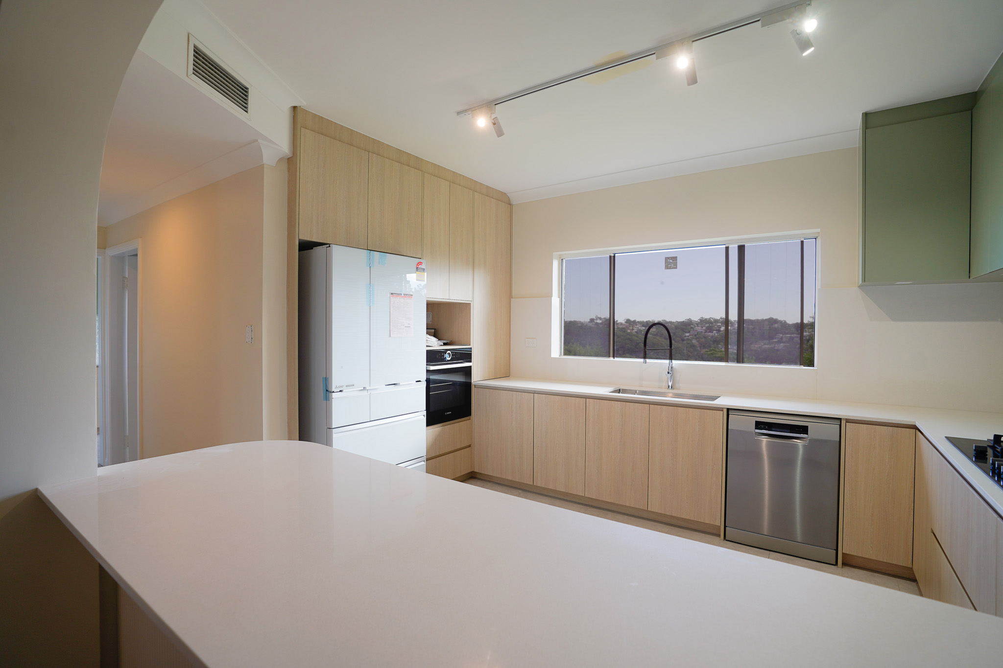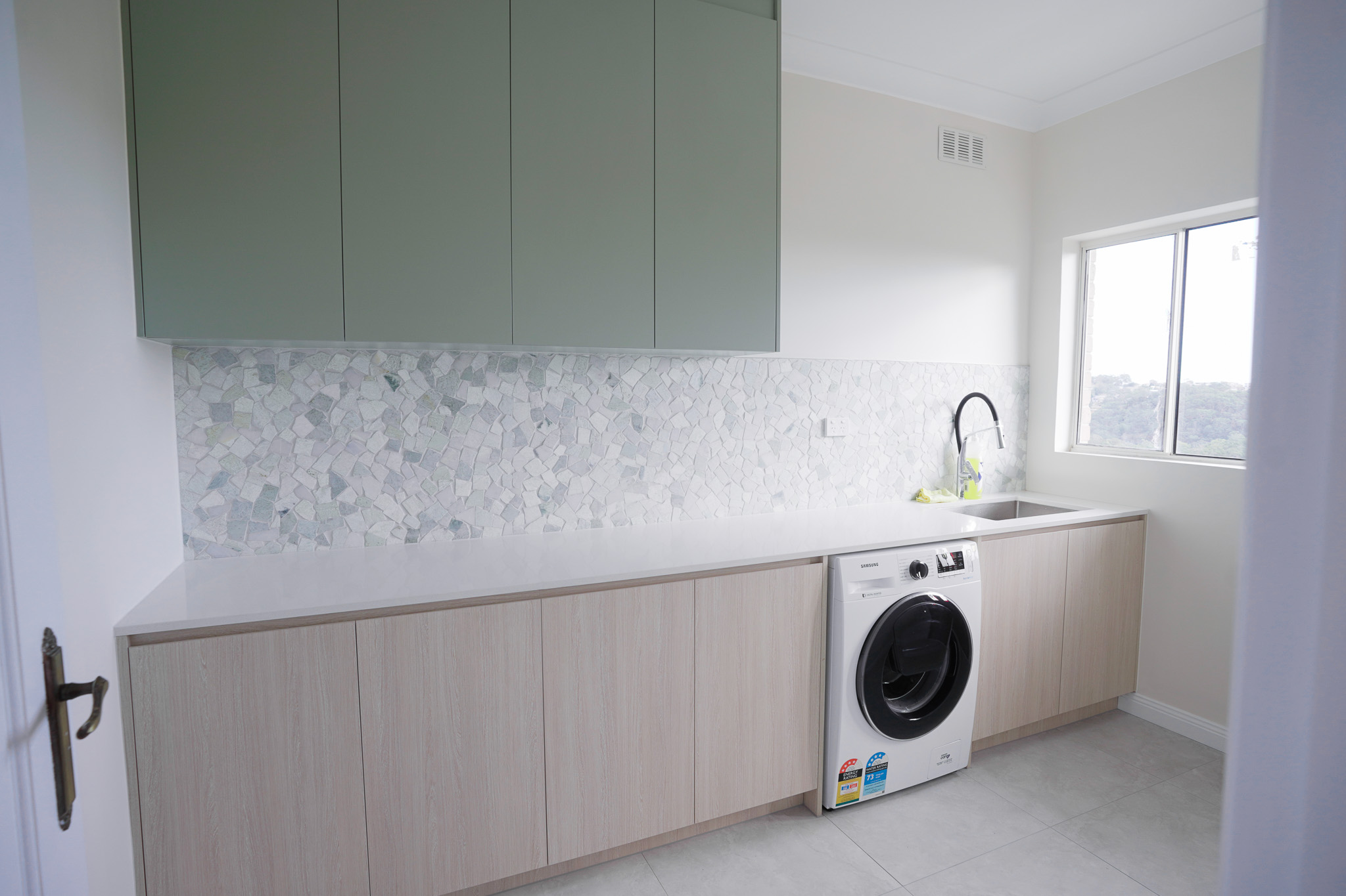 This Illawong renovation transformed an out-dated wallpapered home into a bright and modern family retreat. We reimagined the kitchen with a curved benchtop to open up the space, then completely refurbished all bathrooms with floor-to-ceiling shower screens, his-and-hers showers, underfloor heating, and introduced a Japanese-inspired layout featuring mosaic tiles and a serene bathtub area. A new laundry with mint-green accents, and a timber feature wall in the master bedroom complete the perfect blend of warmth and contemporary style, just to name a few..