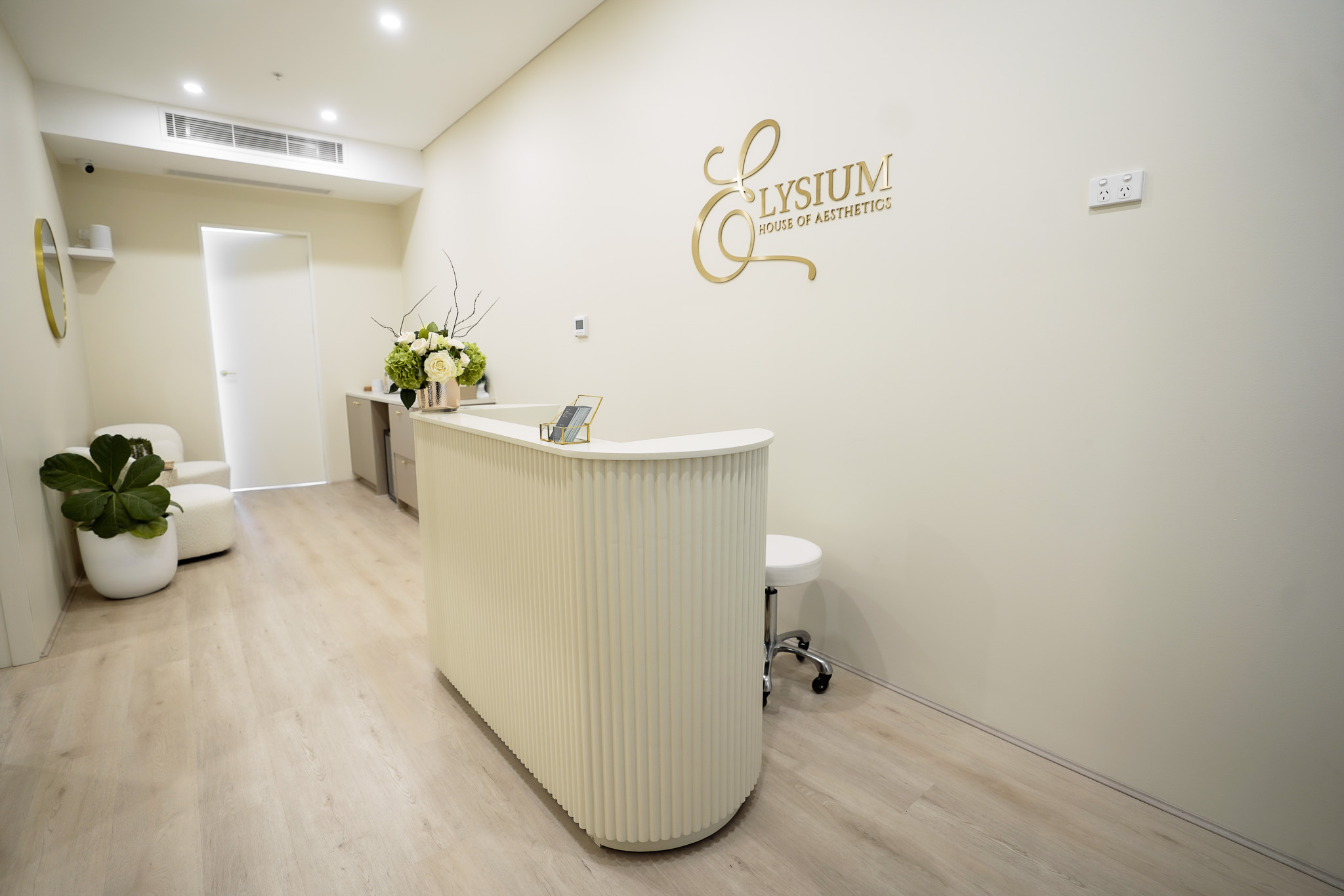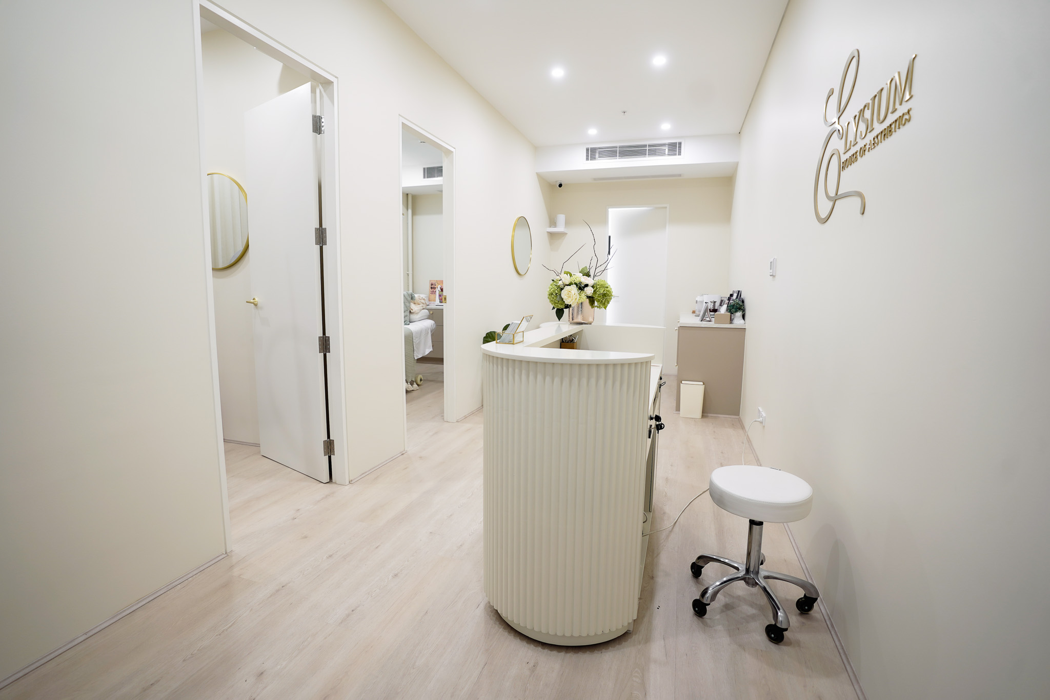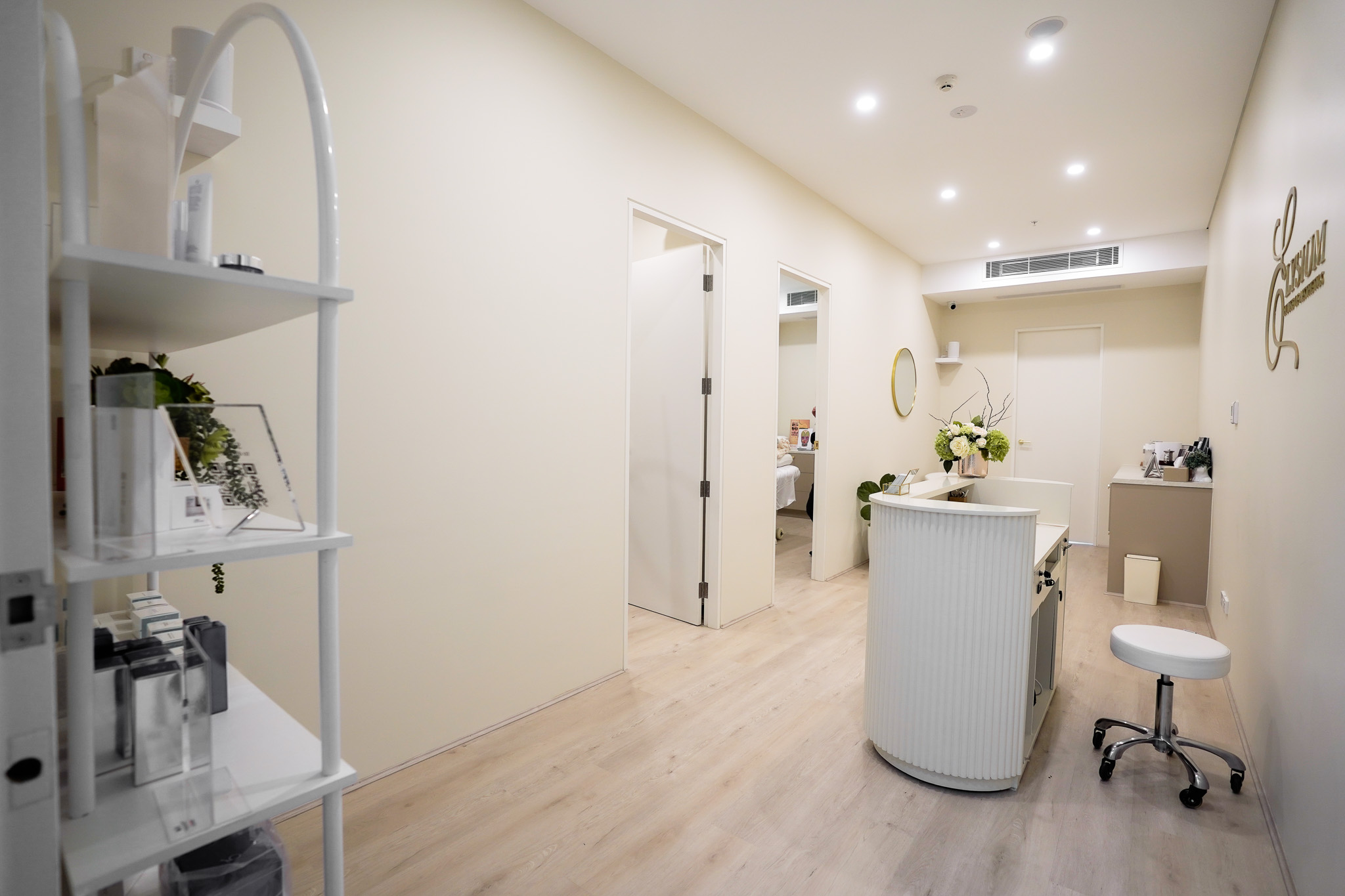 Summer Hill fitout for Elysium Aesthetics transformed an open space into a serene, functional clinic. We created three private treatment rooms, added air conditioning for comfort, custom joinery for coffee and tea service, and soft furnishings to bring warmth and calm to the space.